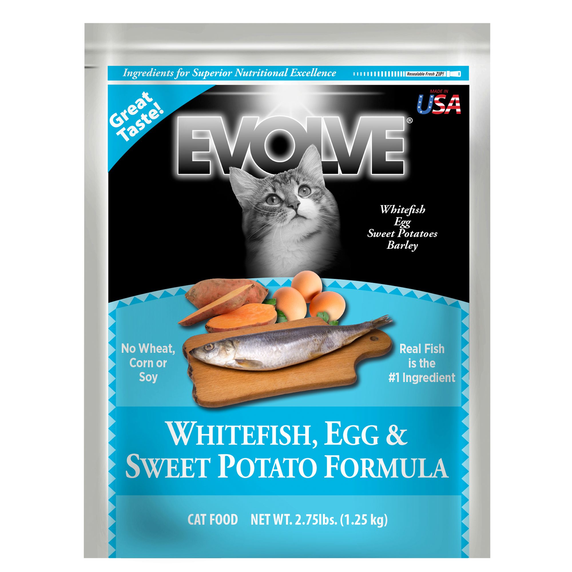 Provide your cat with a delicious and nutritious meal time choice by serving Evolve Whitefish, Egg & Sweet Potato Formula Cat Food. This tasty dry blend features great whitefish flavor in every bite, is wheat, corn and soy free, and is made using a host a host of essential nutrients for the continued good health of your furry friend. Features: No Wheat, Corn or Soy Food Type: Dry Food Form: Bag Food Consistency: Kibble Life Stage: All Flavor: Whitefish, Egg & Sweet Potato Primary Ingredient